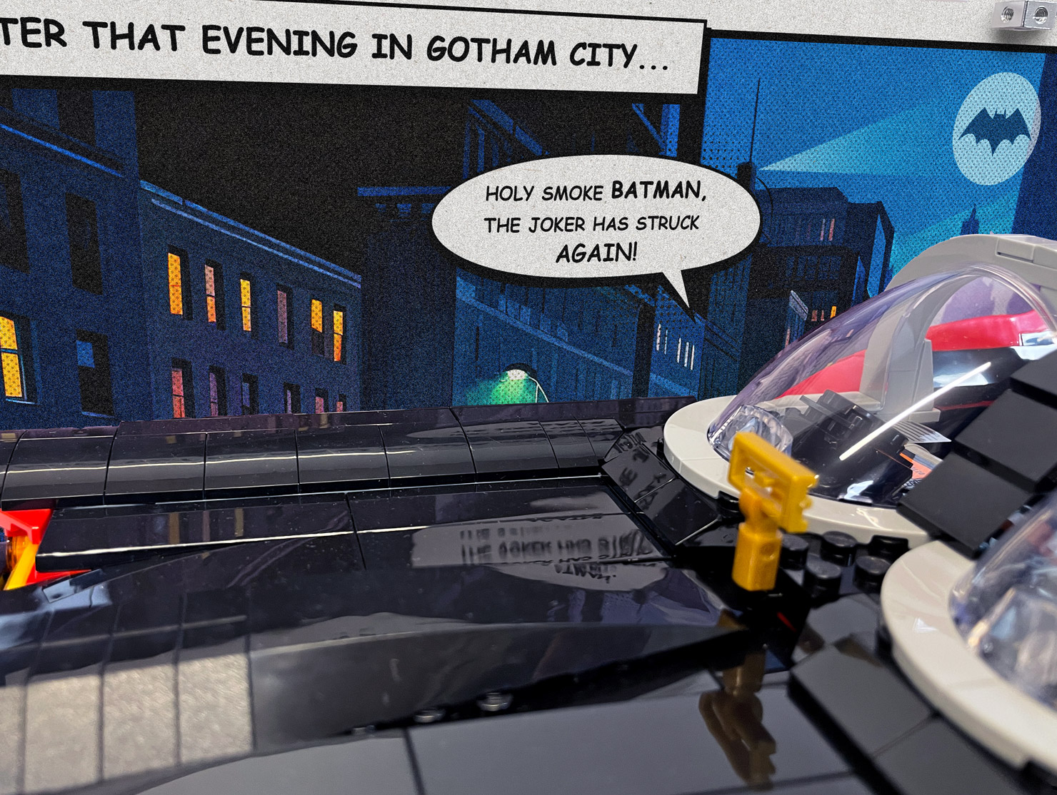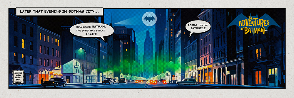 Designed to honour the vibrant spirit of the 1960s television show, this collector’s piece features a dynamic comic book–style backdrop of Gotham City at night—its skyline bathed in moody purples and blues, with the Bat-Signal glowing above. Whether you're a lifelong fan or new to the world of Batman, this display is a bold tribute to one of pop culture’s most enduring symbols of justice.