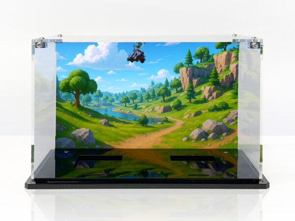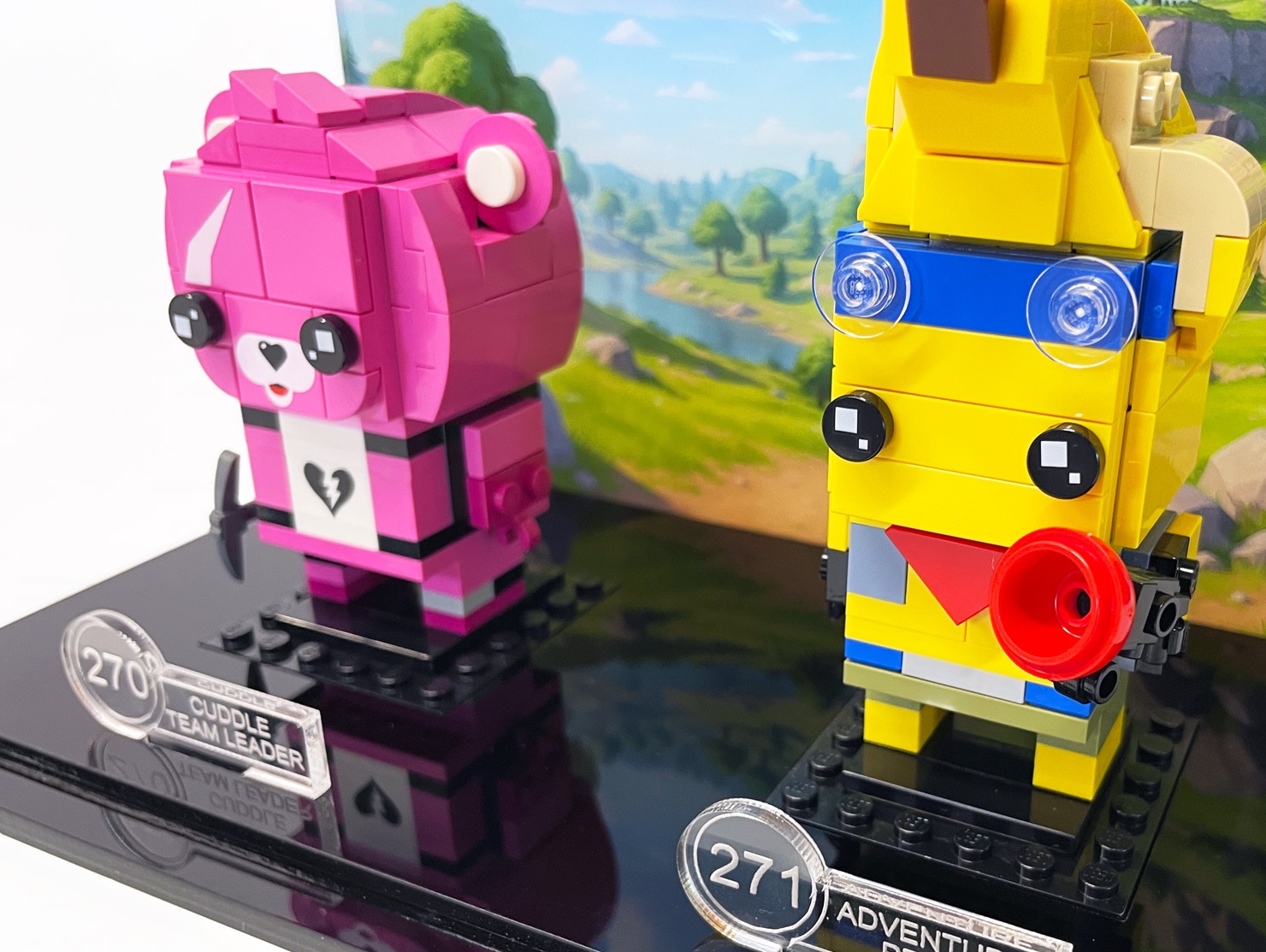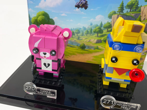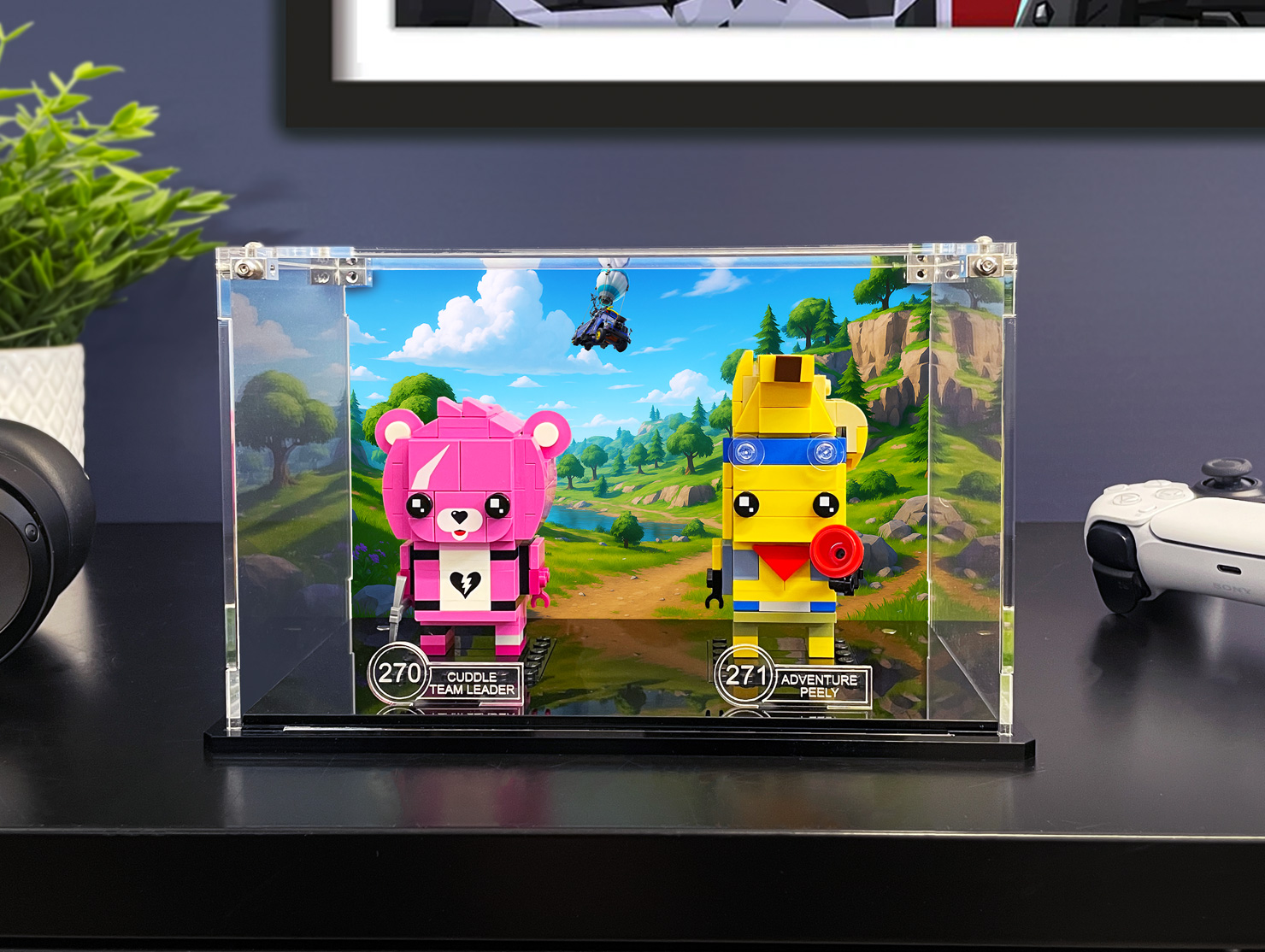 Adventure Peely and Cuddle Team Leader are ready for action in this colourful LEGO display case, complete with a background inspired by Fortnite’s iconic game graphics. Bright, bold, and built to protect your figures, it’s a fun way to show off two of the game’s most unforgettable characters.