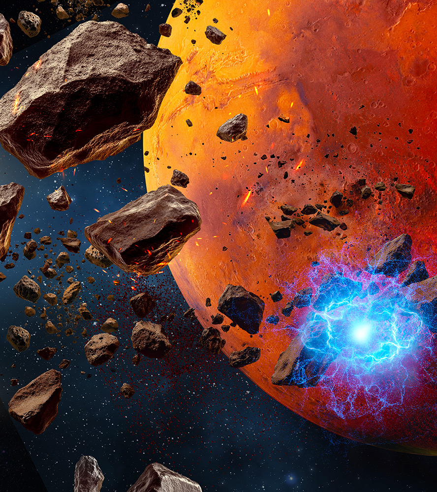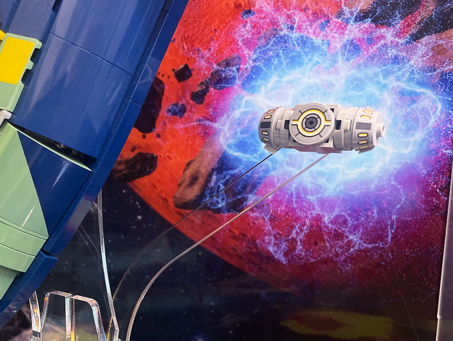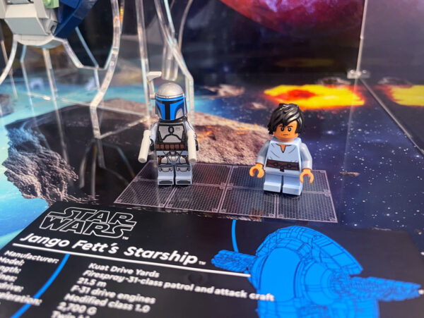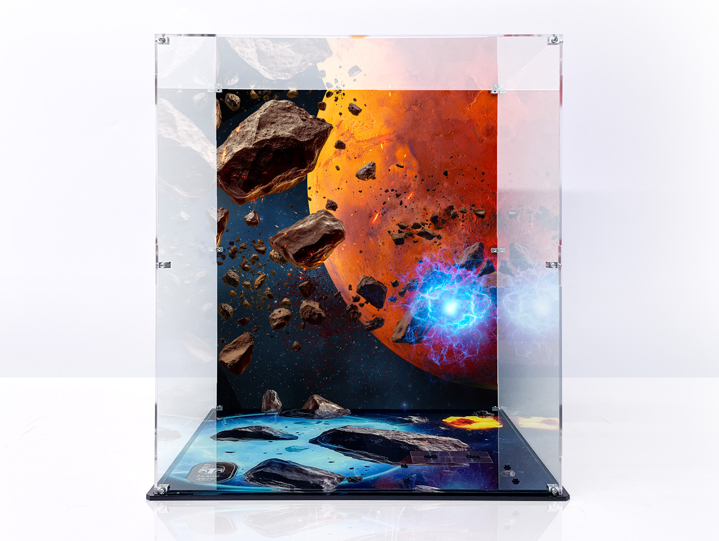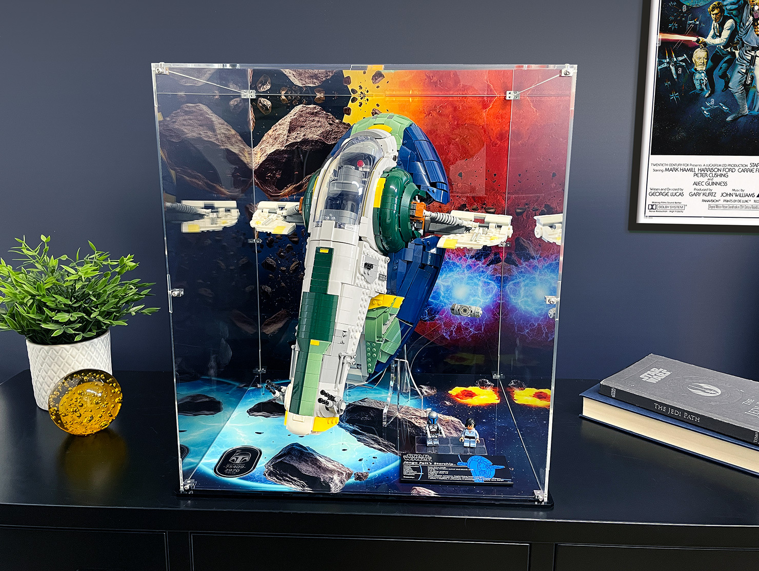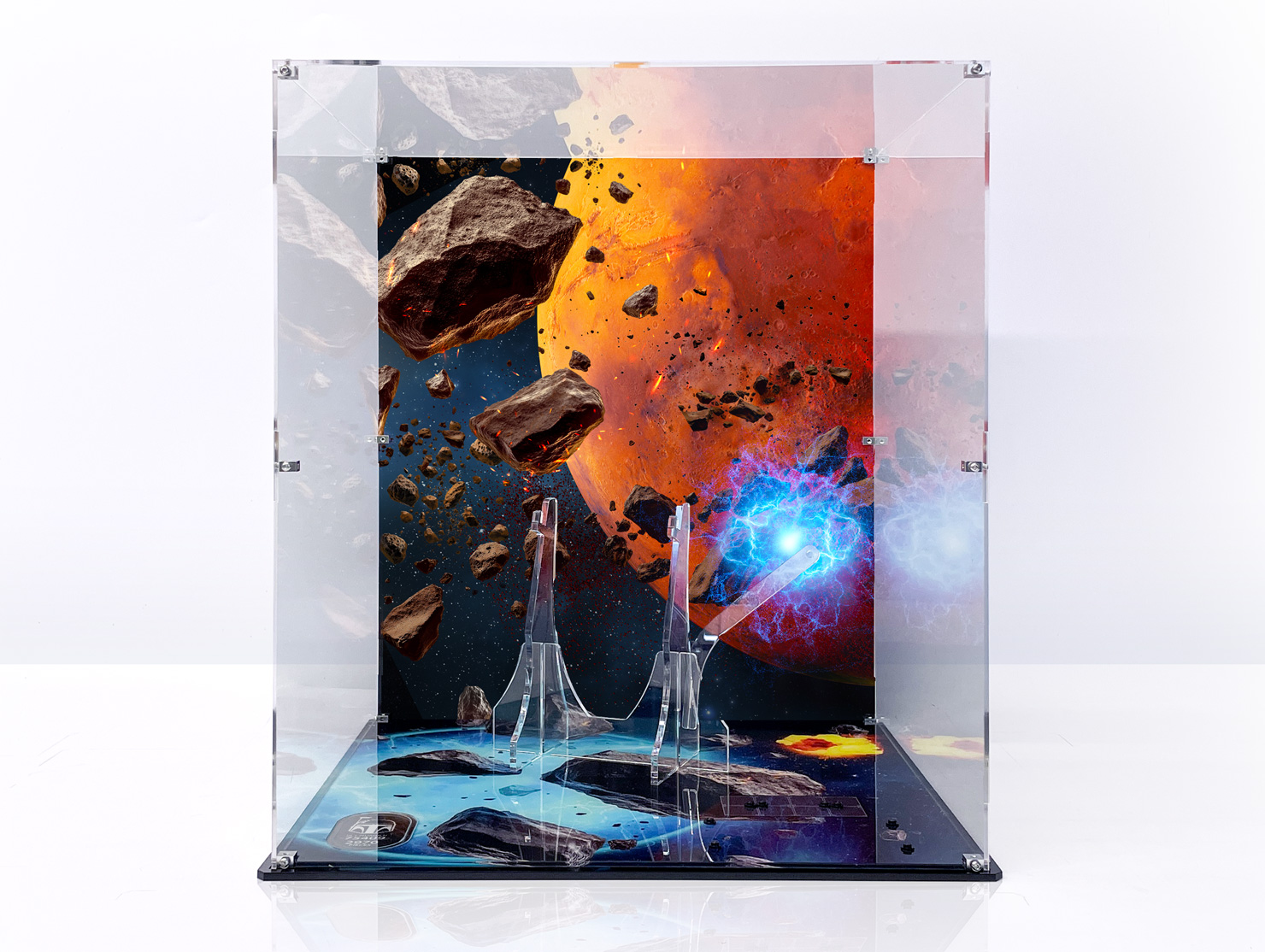 Drop into the Dogfight over Geonosis featured in Attack of the Clones with this custom display case for Jango Fett’s Firespray-Class Starship. A printed backdrop and detailed base set the scene, while the seismic charge hovers mid-blast on its own stand. Clean, bold, and built to showcase the chaos — this is Star Wars frozen at full volume.