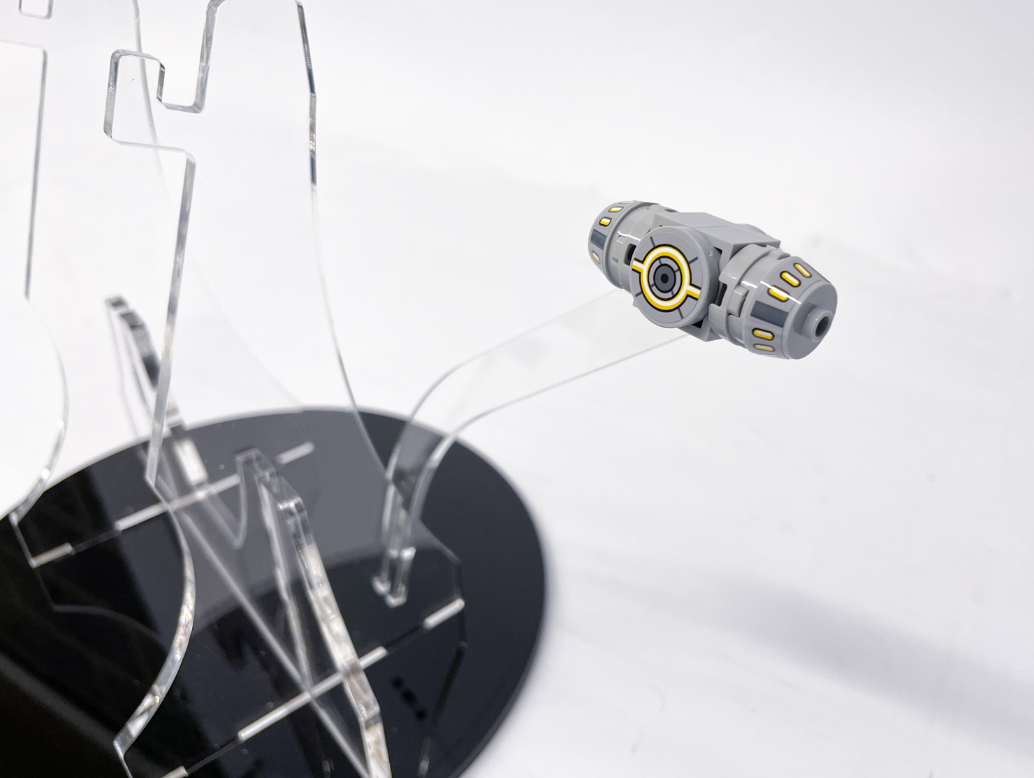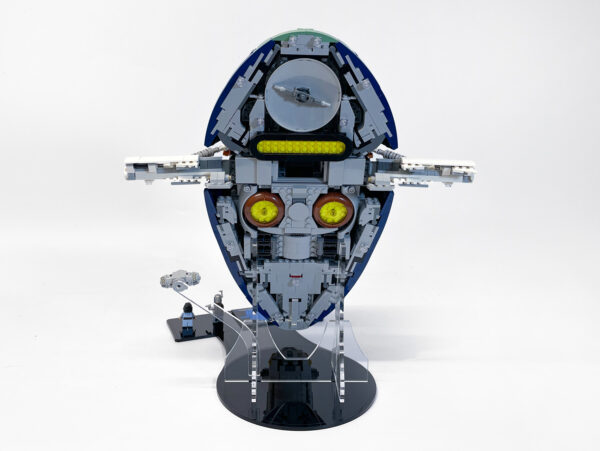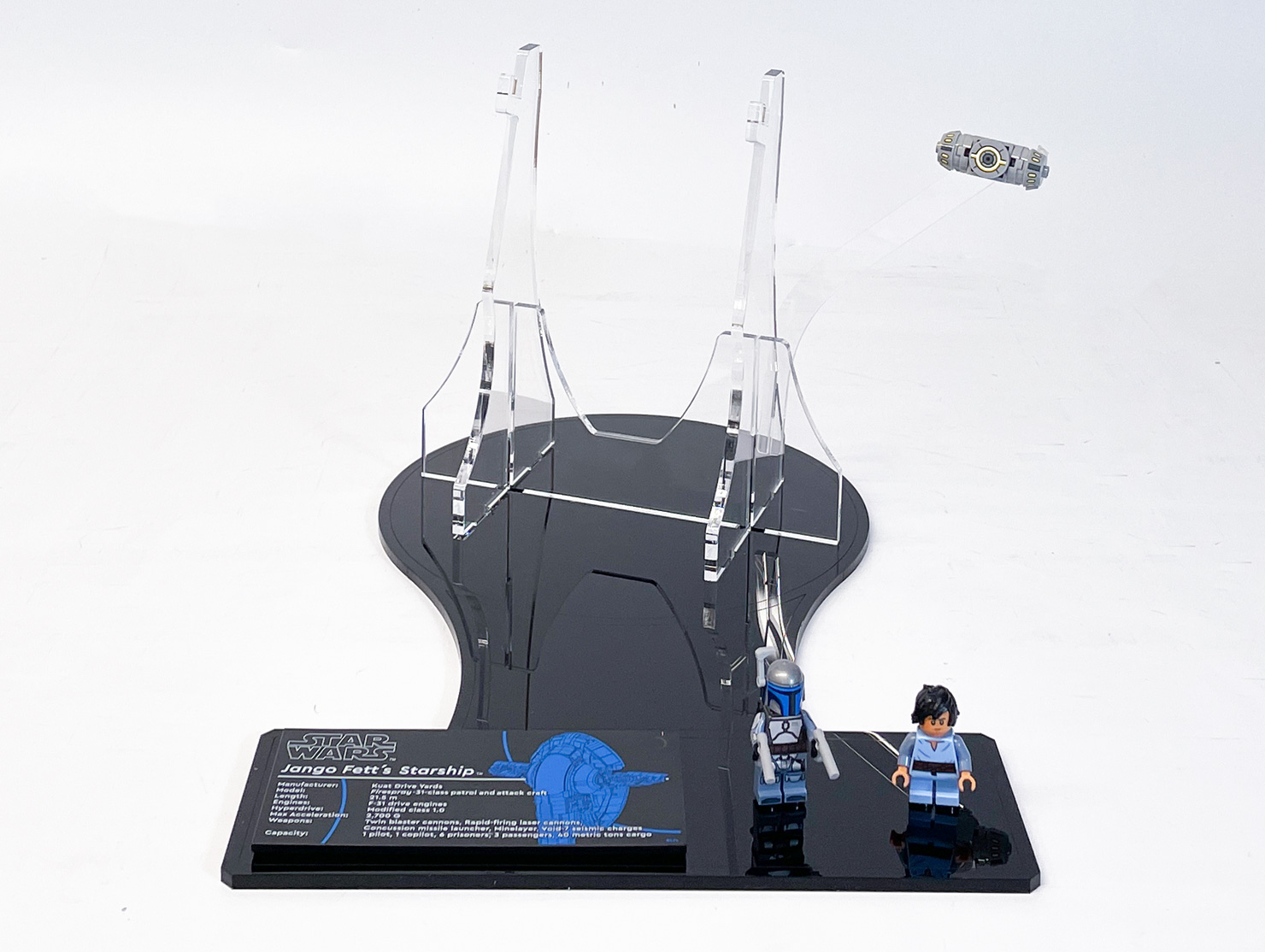 Showcase Jango Fett’s Firespray-Class Starship with this custom display stand designed for clean lines and maximum impact. The minimalist base lets the model take centre stage, while a suspended seismic charge adds dynamic energy to the scene. Integrated LEGO®-branded studs keep your minifigures securely in place.
