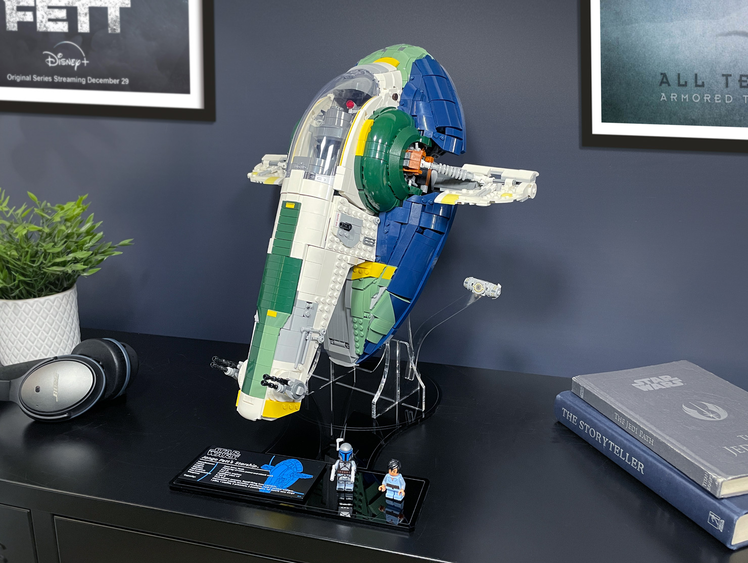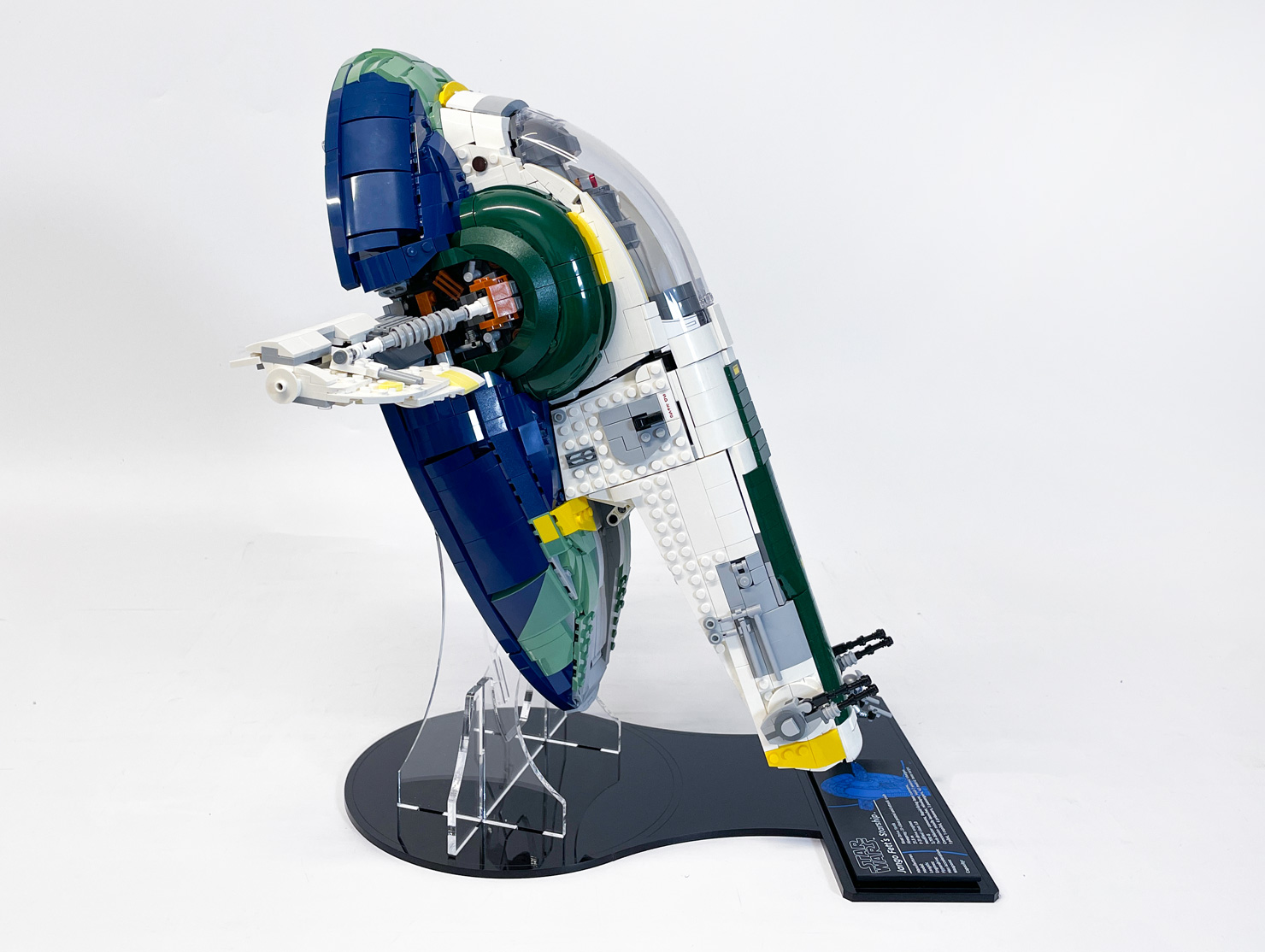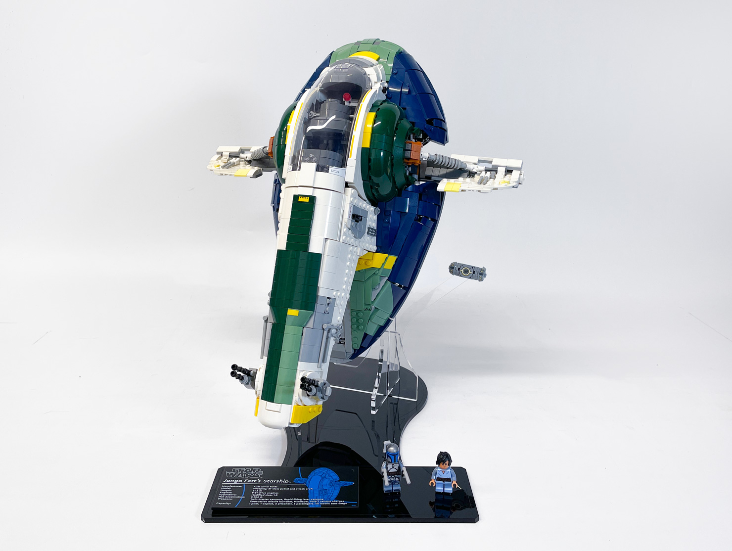 Showcase Jango Fett’s Firespray-Class Starship with this custom display stand designed for clean lines and maximum impact. The minimalist base lets the model take centre stage, while a suspended seismic charge adds dynamic energy to the scene. Integrated LEGO®-branded studs keep your minifigures securely in place.